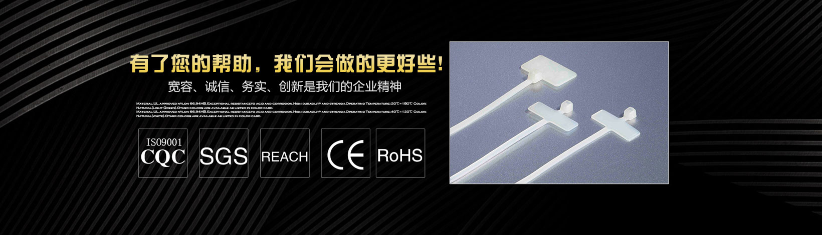 本公司專業(yè)生產(chǎn)銷售尼龍扎帶、特殊型扎帶、吸盤(自粘式定位片)、塑料膨脹管、尼龍壓線帽、電纜防水接頭、鋼釘線卡、R型線夾、飛機型線夾、瓷磚定位十字架、固定座、纏繞管、異型管、齒型管、號碼管、熱縮管、黃臘管、扎絲、鋼管蓋等系列產(chǎn)品。 我們擁有先進的檢測設(shè)備和雄厚的技術(shù)力量,并不斷優(yōu)化生產(chǎn)流程,規(guī)范生產(chǎn)環(huán)節(jié),加強完善質(zhì)量控制系統(tǒng),以優(yōu)異的品質(zhì)深得海內(nèi)外客戶的一致好評。